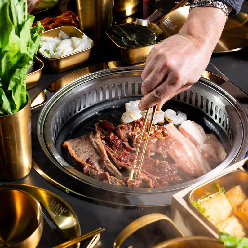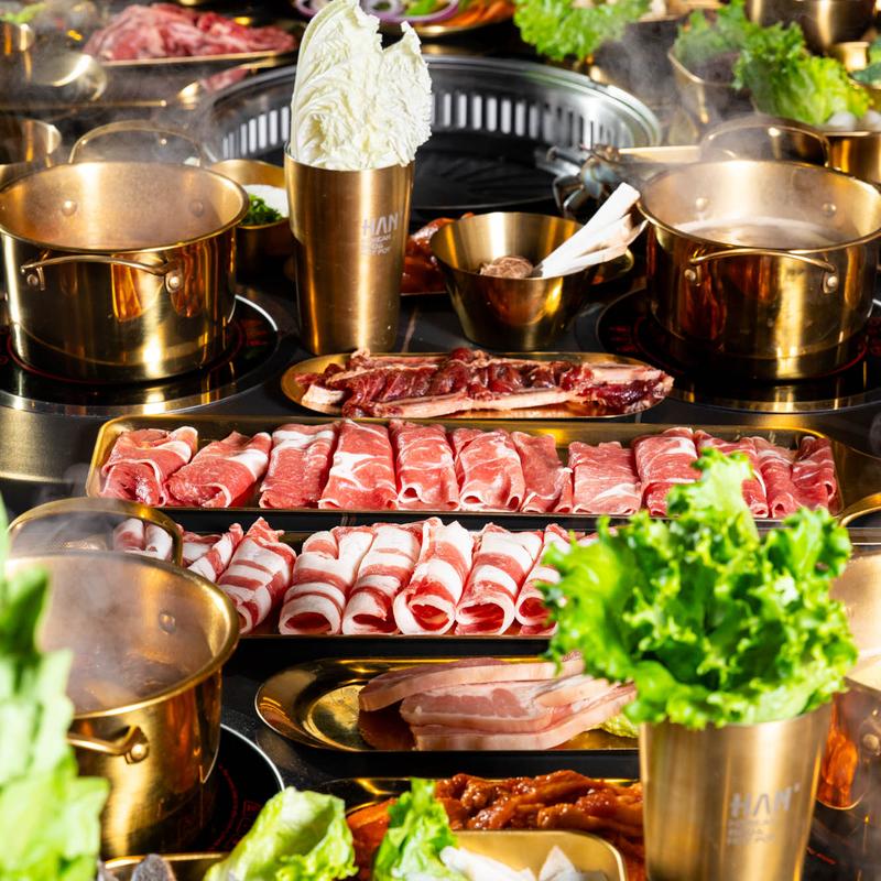 Step into HAN Korean BBQ & Hot Pot, where sleek design meets cozy accents, perfect for intimate dinners or lively gatherings. At HAN, quality is our hallmark. Enjoy grilling top-tier cuts right at your table, ensuring fresh and flavorful bites every time.